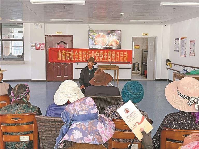 图⑦:山南市社会组织行业党委开展主题党日活动,老党员洛桑向大家讲述新旧西藏对比。