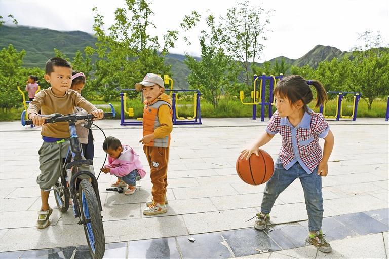 图为山南市加查县冷达乡共康村的孩子们在干净整洁的广场上玩耍。